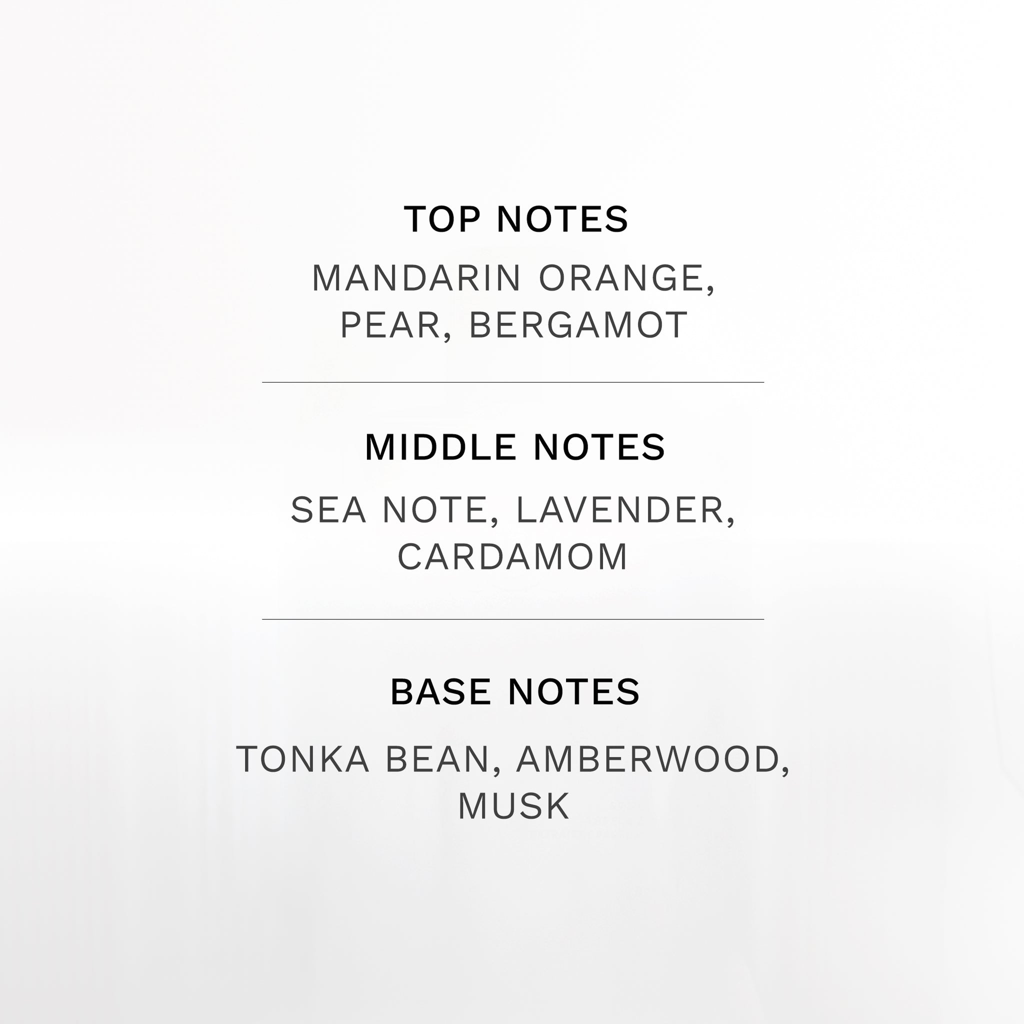 MANDARIN, ORANGE, PEAR, BERGAMOT, SEA NOTE, LAVENDER, CARDAMOM, TONKA, BEAN, AMBERWOOD, MUSK