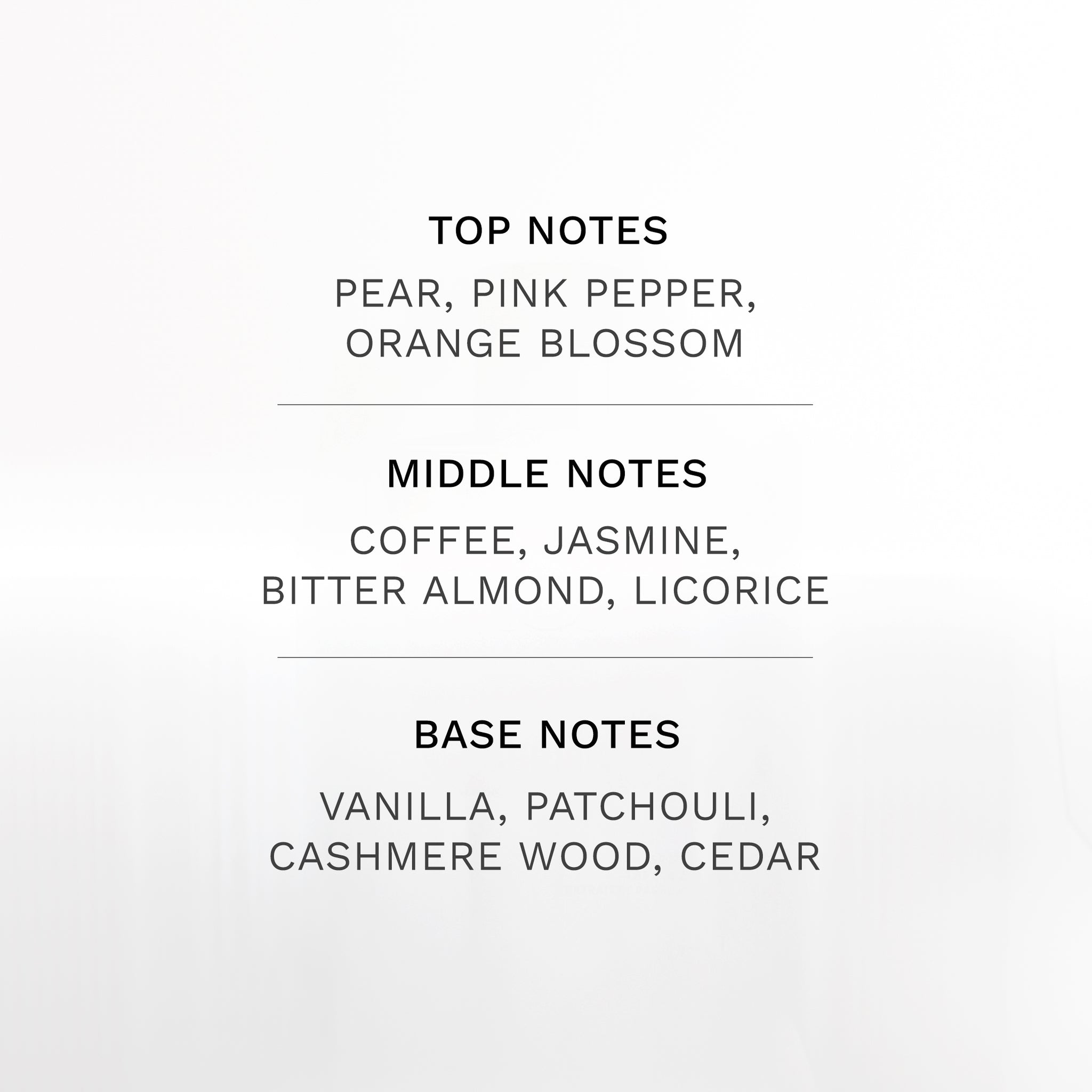 PEAR, PINK, PEPPER, ORANGE BLOSSOM, COFFEE, JASMINE, BITTER ALMOND, LICORICE, VANILLA, PATCHOULI, CASHMERE WOOD, CEDAR