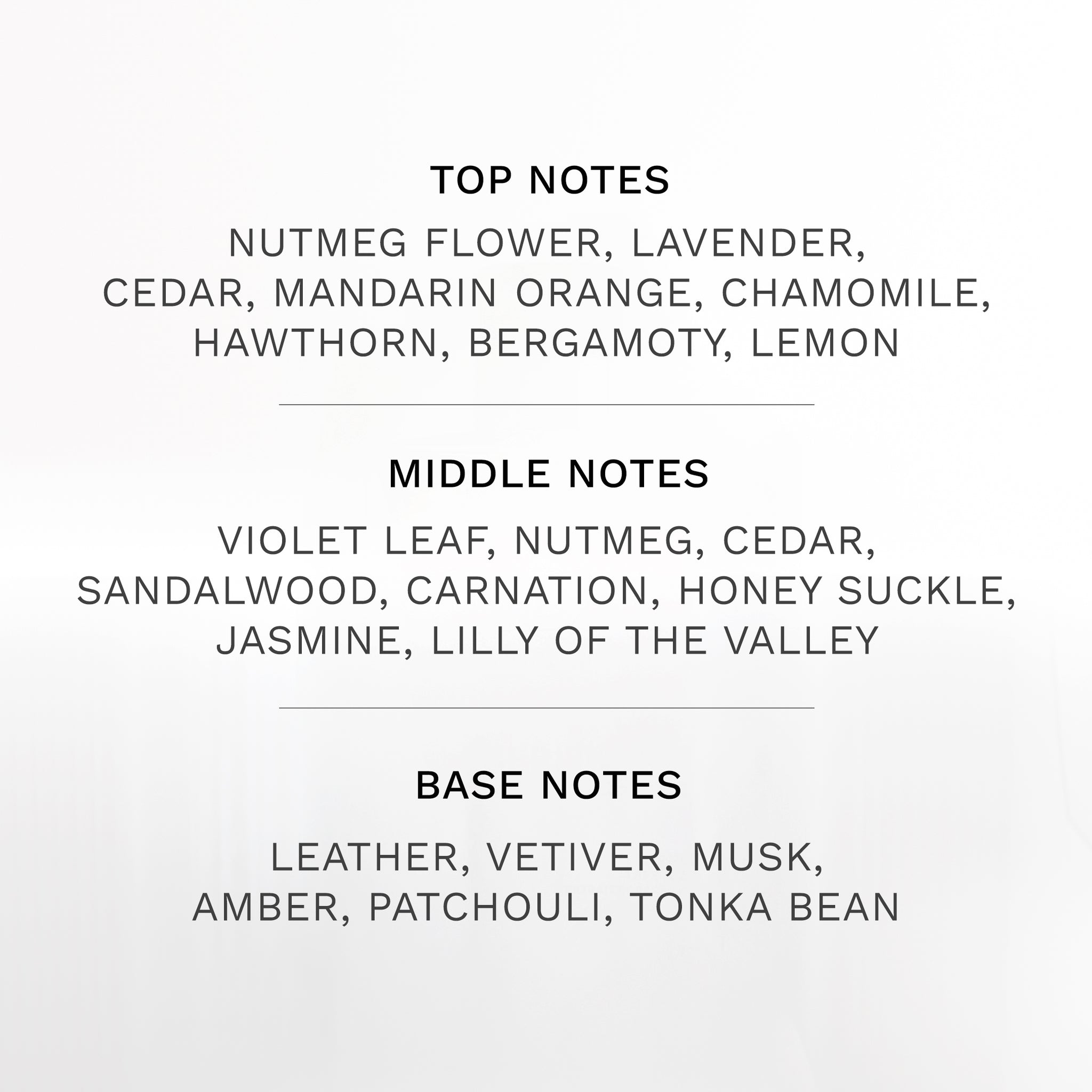NUTMEG, FLOWER, LAVENDER, CEDAR, MANDARIN ORANGE, CHAMOMILE, HAWTHORN, BERGAMOTY, LEMON, VIOLET LEAF, NUTMEG, CEDAR, SANDALWOOD, CARNATION, HONEY SUCKLE, JASMINE, LILLY OF THE VALLEY