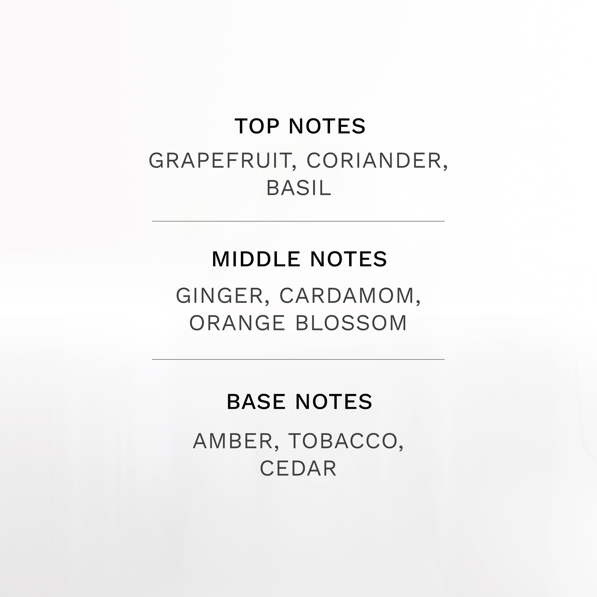 GRAPEFRUIT, CORIANDER, BASIL, GINGER, CARDAMOM, ORANGE BLOSSOM, AMBER, TOBACCO, CEDAR