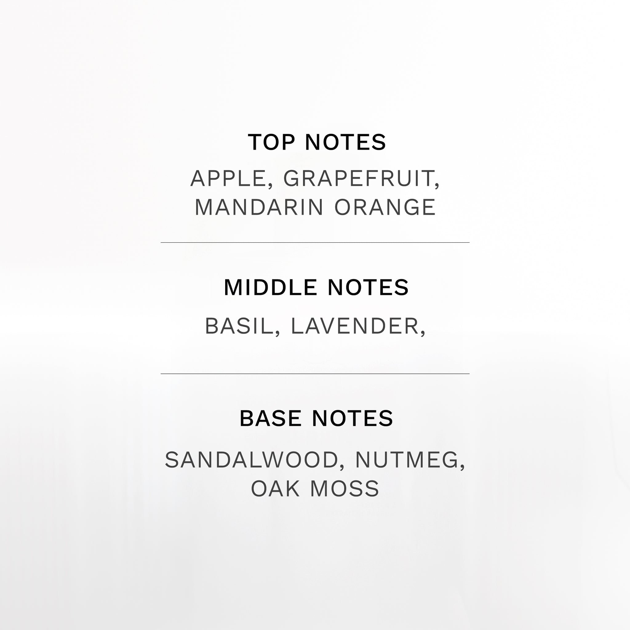 APPLE, GRAPEFRUIT, MANDARIN ORANGE, BASIL, LAVENDER, SANDALWOOD, NUTMEG, OAK MOSS
